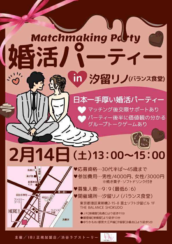 対面開催の婚活パーティー開催案内(汐留、2026/2/14、30代半ば〜45歳)